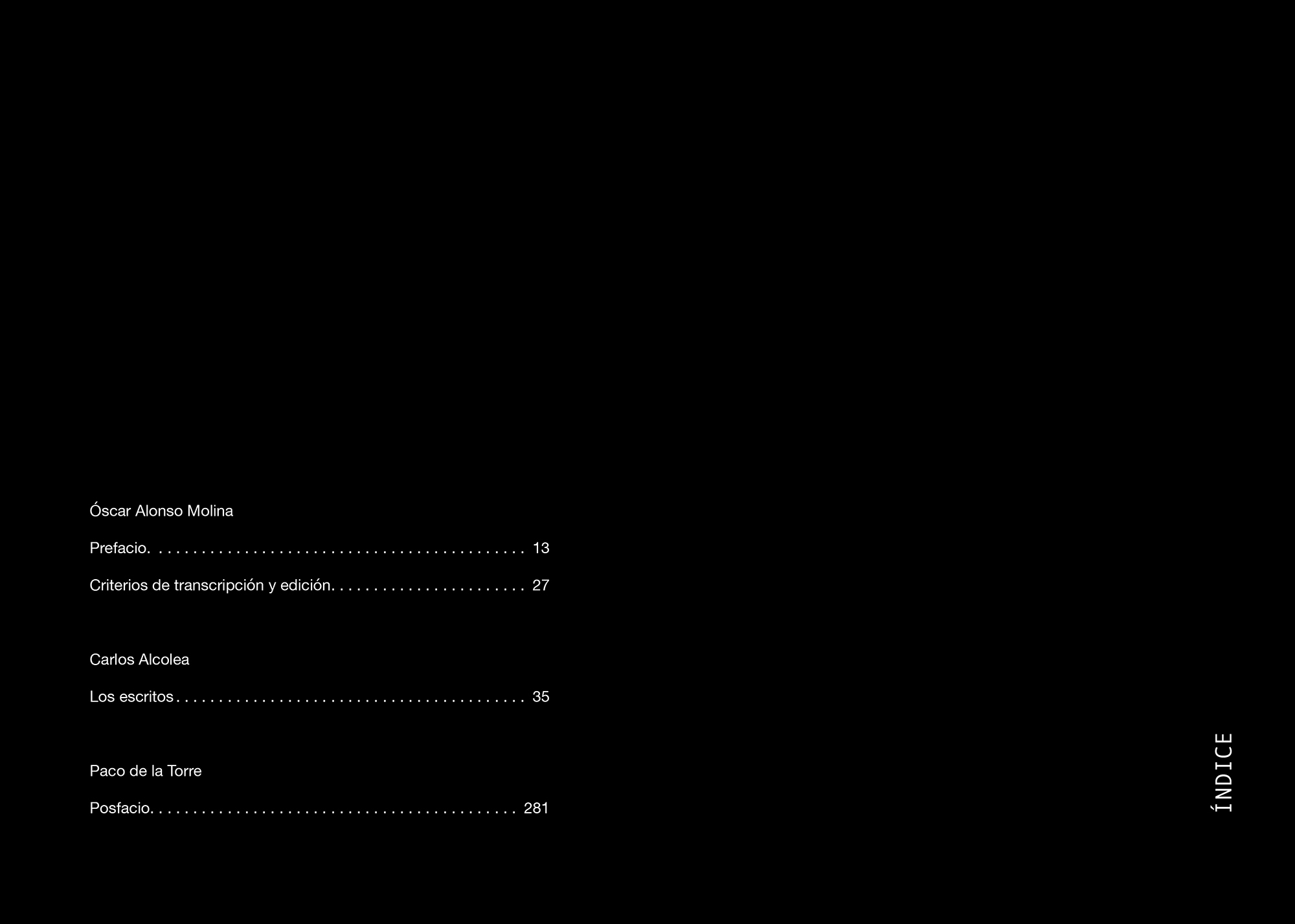 Óscar Alonso Molina (Madrid, 1971). Doctor en Bellas Artes con una tesis sobre el pensamiento estético de Carlos Alcolea, es crítico de arte y comisario independiente de exposiciones. Ensayista y conferenciante habitual, su trabajo se centra en las manifestaciones artísticas de nuestro presente, dedicando especial atención a distintos aspectos relacionados con la retórica visual y el desarrollo de las estrategias textuales y narrativas, en especial desde la práctica del dibujo, así como desde sus procesos interdisciplinares. En su interés por el legado textual de los artistas contemporáneos ha abordado recientemente la edición de los Cuadernos (1964-2020), el artista portugués Jorge Martins, o la Antología de textos (1976-2021), de Guillermo Pérez Villalta, a las que se ahora se suma este libro.